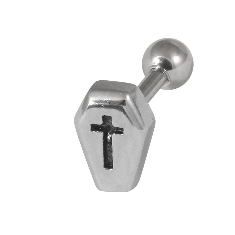 This threaded Surgical Steel Micro Barbell in 1.2mm gauge with a Cast Steel Coffin attachment is available in lengths 5mm to 12mm. This is great for use in your lip piercing or in the ear, particularly, the rim, helix, tragus, etc, but can also be used in other piercings. The Coffin attachment is sold on labret bars and by themselves also. Coffin is 6mm wide and 8.2mm high. The Coffin top is an oxidised effect item and should not be brought into contact with solvents such as alcohol.
