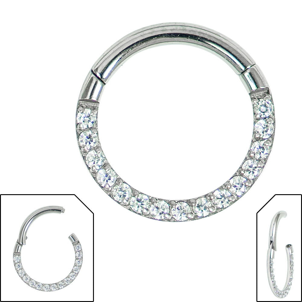 Available in Surgical Steel and Gold Steel, this sparkling jewelled pave eternity clicker ring feature front facing Claw Set Crystal Clear gems and an easy to use hinged opening that clicks shut for a secure closure. These are great for piercings like Septum, Daith etc. Available in 1.2mm gauge in both 8mm internal diameter and 10mm. The 8mm has 14 claw set cz crystals. The 10mm has 19 cz crystals. Also available in titanium if you would like.