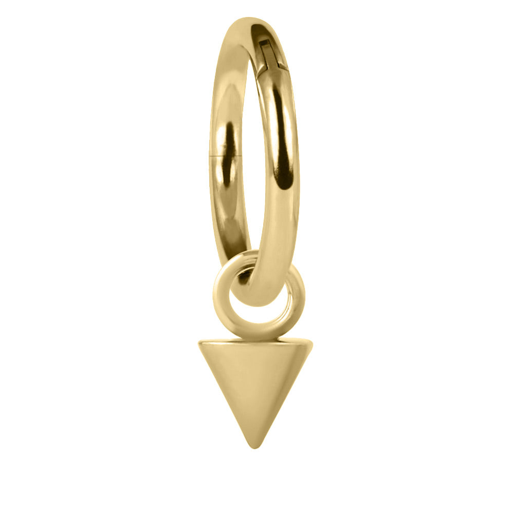 The Steel Cone Charm on a Steel Hinged Ring. The charm is 4mm tall and 4mm wide and looks best in helix, rook, lobe piercings among others, depending on the gauge and diameter of the ring selected The rings are available in various sizes in 0.8mm, 1.0mm, 1.2mm and 1.6mm gauges in Surgical Steel. Also available in select sizes of Gold Steel.
