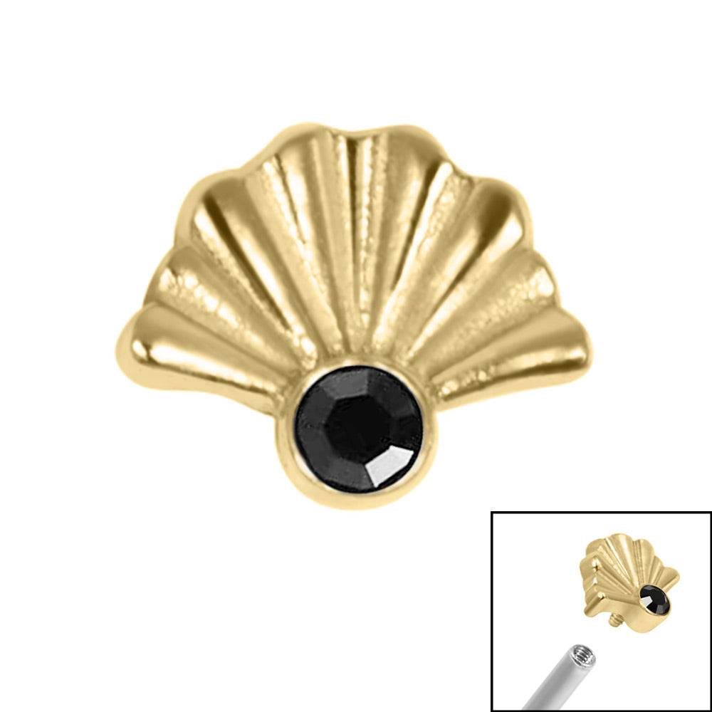 Take your look back in time to with our Jewelled Deco Fan. This petite fan is inspired by period styles complimented with a Jet Black CZ jewel. Available in Steel and Gold Steel. It is 4.5mm at its widest and 3.7mm tall. Suitable for internal threaded shafts measuring 1.2mm and has the standard 0.9mm thread on it. This attachment will fit internal thread Labret Studs, Bars etc.