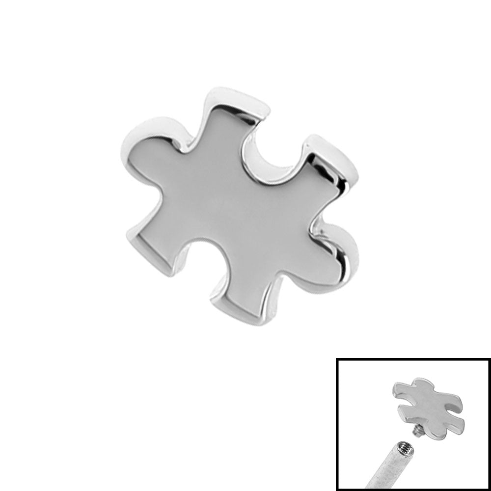 This 316L Surgical Steel Jigsaw Piece attachment is for internal threaded shafts measuring 1.2mm. This attachment is approximately 7.5mm wide and 6mm high and has the standard 0.9mm thread on it. This attachment will fit internal thread Labret Studs, Bars etc. Also available for 1.6mm gauge internal thread shafts.