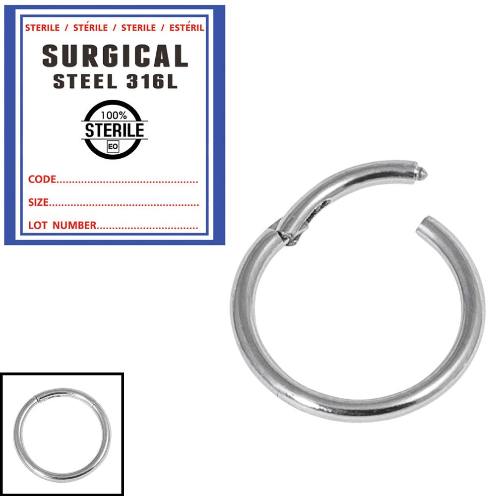 Sterile Surgical Steel Hinged Segment Clicker Rings. Ready to use, Sterile Steel Jewellery to help the body piercing professional. Very convenient! Ethylene Oxide (EO) Sterilisation for maximum quality and confidence. Pre-sterilised piercing jewellery is individually sealed, dated and sterile for up to 5 years.