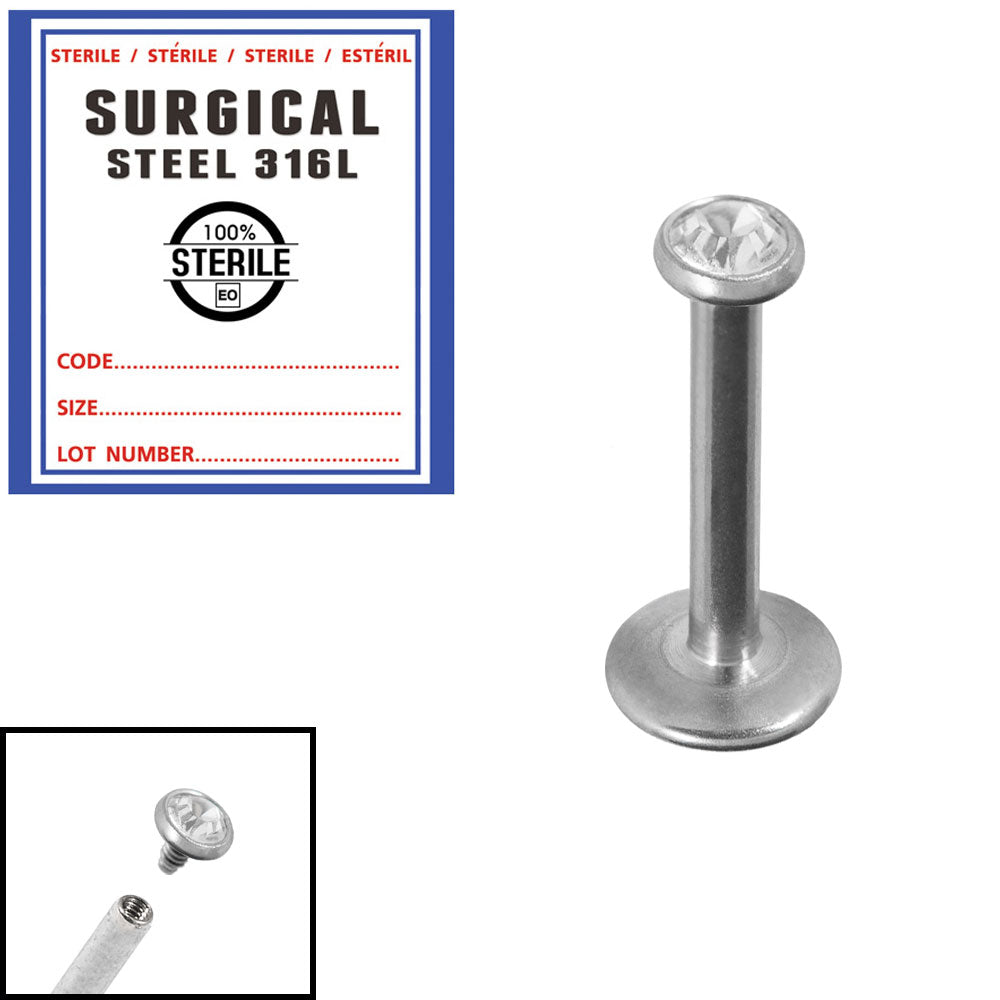 Sterile Steel Internal Thread Jewelled Labret. The labret shaft is not threaded as usual but is hollow with the thread on the inside. The attachment (eg: jewelled ball) has a small threaded protruding. The benefit of this is that the labret is more comfortable to fit and that a smaller attachment can be used leading to a more subtle piercing. Ready to use, Sterile Steel Jewellery to help the body piercing professional. Very convenient! Ethylene Oxide (EO) Sterilisation for maximum quality and confidence. Pre-sterilised piercing jewellery is individually sealed, dated and sterile for up to 5 years.