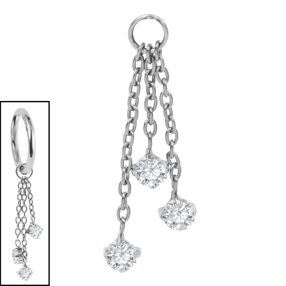 The Titanium Trilogy Jewelled chain drop charm can be used on a variety of jewellery in many piercings up to 1.6mm gauge may that be a Barbell, Labret or ring. The choice is yours! The Longest of the 3 chains measures 17mm and the charm has 3 claw set clear CZ.
