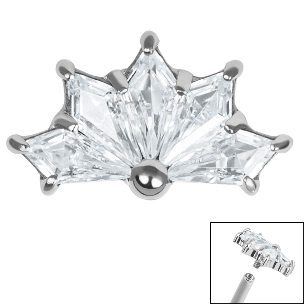 Introducing the mesmerizing Jewelled Sensu Kite Fan featuring five stunning kite-shaped gems meticulously set within a delicate framework. The fan-like arrangement of the gems creates a sense of movement and fluidity, symbolizing grace and beauty. Available in Mirror Polish Titanium. This top is approximately 10mm wide and 6mm high. For internal threaded shafts measuring 1.2mm and has the standard 0.9mm thread on it. This attachment will fit TDi internal thread Labret Studs, Bars etc.