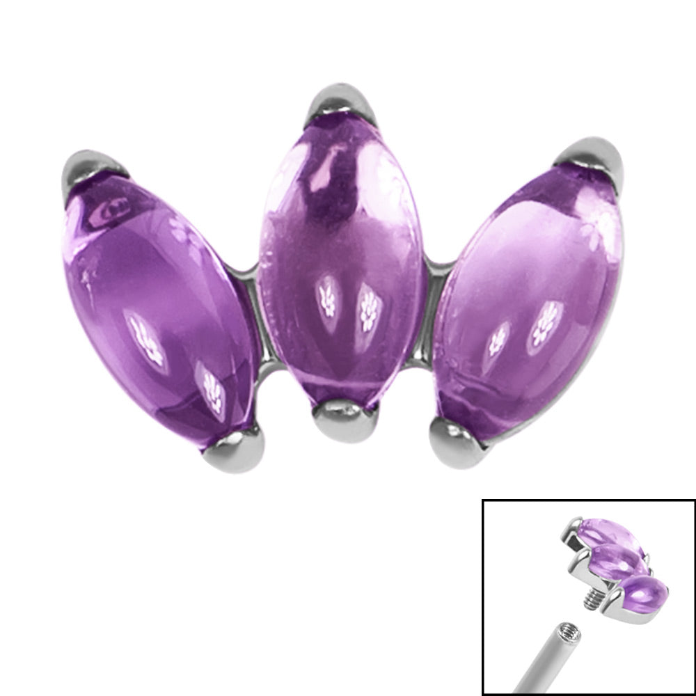 These natural, semi-precious stones have gorgeous colour and will add a pop to your style with these 3 Stone Marquise Fans. They are approximately 5mm tall and 7mm wide and are available in Mirror Polish Titanium. These tops are for internal threaded shafts measuring 1.2mm and have the standard 0.9mm thread on them. This attachment will fit internal thread Labret Studs, Bars etc.