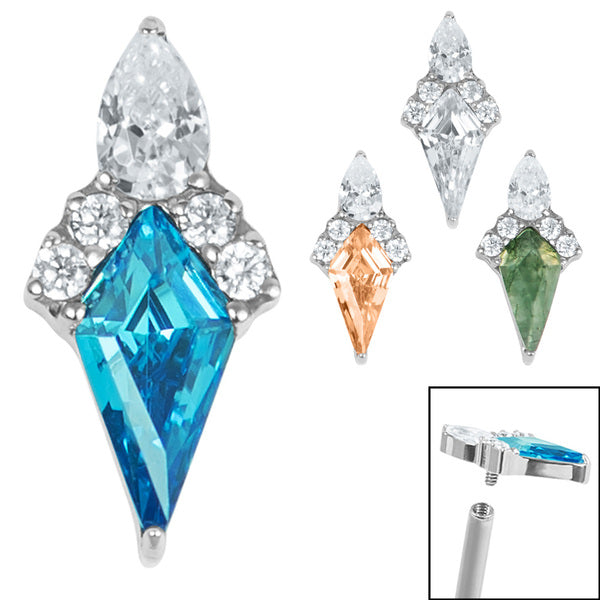 This absolutely beautiful kite-shaped gem is highlighted by a pear shaped jewel and four further round gems. The Stella Jewelled Kite is sure to catch the eye. Available in Mirror Polish Titanium. This top is approximately 10mm high and 5mm at its widest point. For internal threaded shafts measuring 1.2mm and has the standard 0.9mm thread on it. This attachment will TDi fit internal thread Labret Studs, Bars etc.