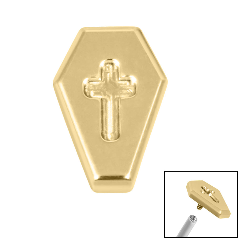 The Titanium Coffin is available in Mirror Polish Titanium as well as Gold Titanium. The coffin is 6.7mm tall and 4.6mm wide. For internal threaded shafts measuring 1.2mm and has the standard 0.9mm thread on it. This attachment will fit TDi Body Jewellery internal thread Labret Studs, Bars etc.