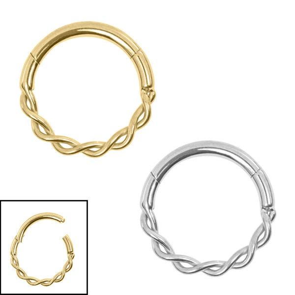 This ring features two gracefully entwined bands that symbolize connection and balance.. The ring has an easy to use hinged opening that clicks shut for a secure closure. In top-quality Titanium and Gold Titanium, these are great for piercings like Septum, Daith etc. Available in 1.2mm gauge in both 8mm internal diameter and 10mm.