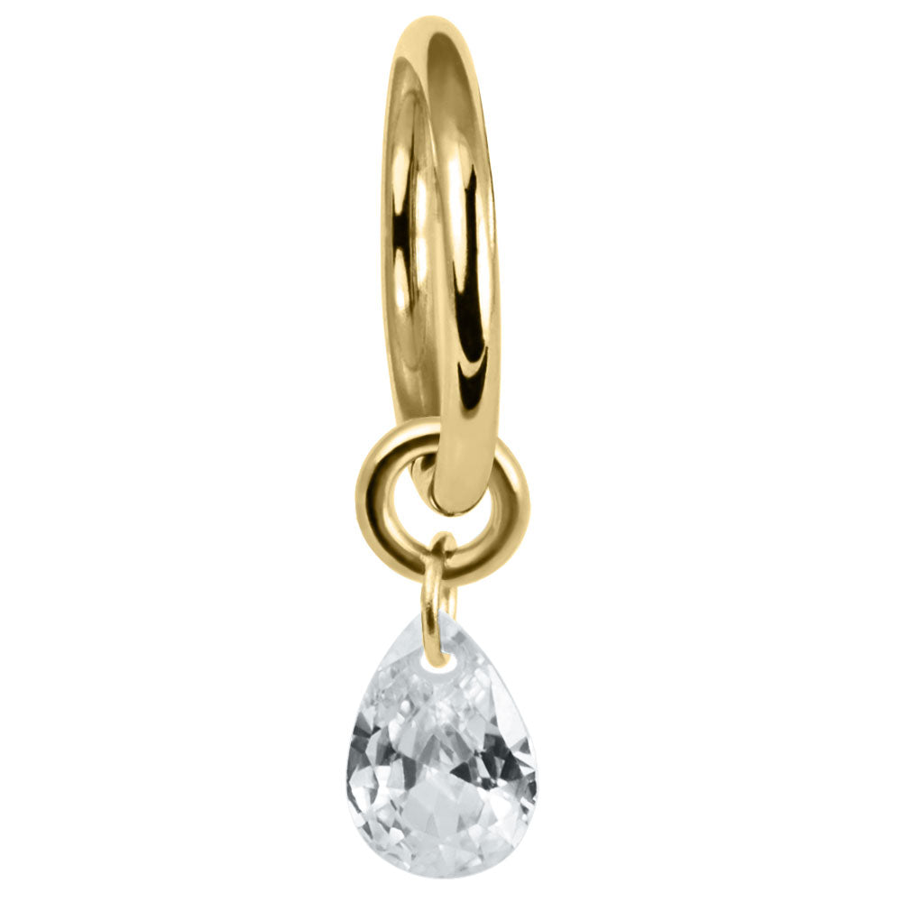 The Titanium Floating Teardrop Gem Charm on a Titanium Hinged Ring and looks best in helix, rook or lobe piercings, among others, depending on the gauge and diameter of the ring selected. The beautiful and sparkly Crystal Clear CZ Gem Charm itself is 4mm in diameter at its widest point and 6mm in height. The rings are available in various sizes in 0.8mm, 1.0mm and 1.2mm gauge. Available in Titanium and Gold Titanium.