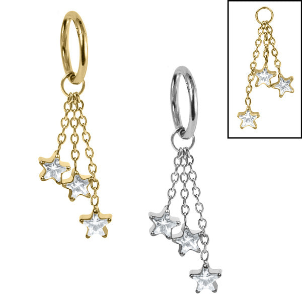 The Titanium Trilogy jewel Star chain drop Charm on a Titanium Hinged Ring and has a beautiful claw set cz jewel stars at the bottom of each chain. The Longest of the 3 chains is 17mm. The rings are available in various sizes in 0.8mm, 1.0mm and 1.2mm gauge. Available in Titanium and Gold Titanium.