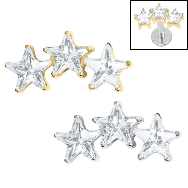 A trio of sparkling claw set star gems in our Titanium 3 Sisters Jewelled Stars. This top is approximately 9mm wide and 4.5mm high. For internal threaded shafts measuring 1.2mm and has the standard 0.9mm thread on it. This attachment will fit TDi internal thread Labret Studs, Bars etc.