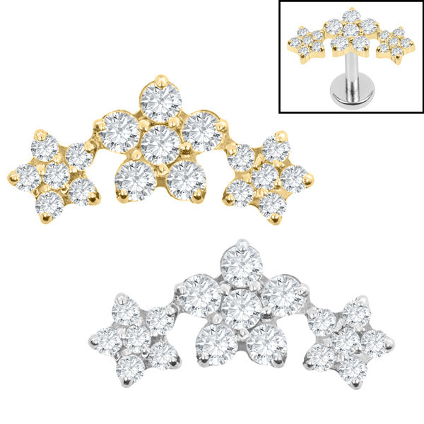 A gorgeous claw set floral arrangement of 3 dazzling cz flowers the Alice trio would look gorgeous in a helix piercing. This trio of flowers is approximately 7mm tall and 13mm wide. Titanium jewellery is perfect for new piercings. This attachment has the standard 0.9mm thread on it that will fit TDi internal thread Labret Studs, Bars etc that measure 1.2mm gauge.
