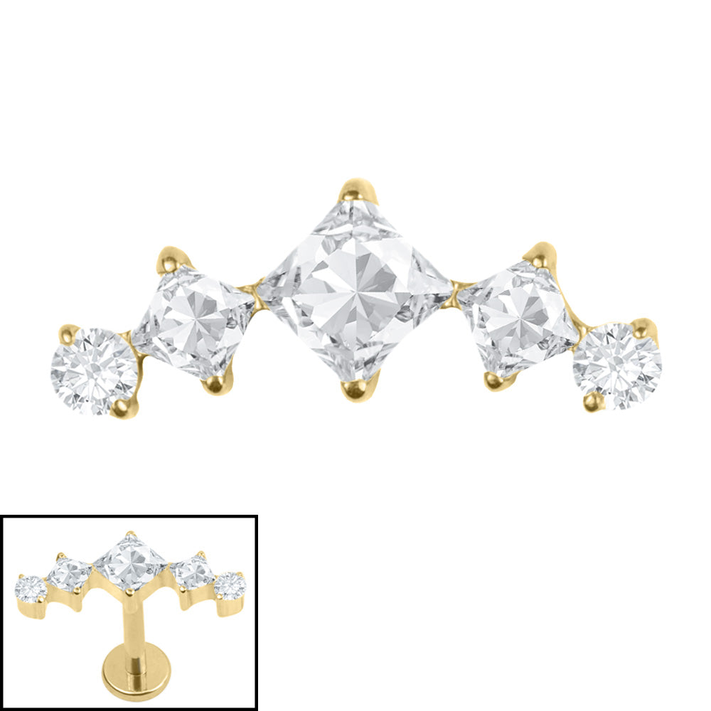 Our Titanium Claw Set Jewelled Twilight Curve is a 5 jewelled curve with 3 princess cut square CZ stones and 2 claw set round CZ on the end. Titanium jewellery is perfect for new piercings. This attachment is approximately 5mm tall and 12.5mm wide and has the standard 0.9mm thread on it. It will fit TDi internal thread Labret Studs, Bars etc that measure 1.2mm gauge and is available in Mirror Polish or Gold Titanium.