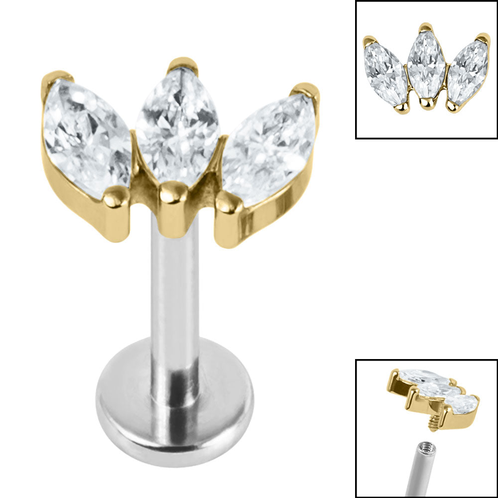 Titanium Internally Threaded Labrets 1.2mm - Gold Titanium Claw Set 3 CZ Jewel Marquise Fan