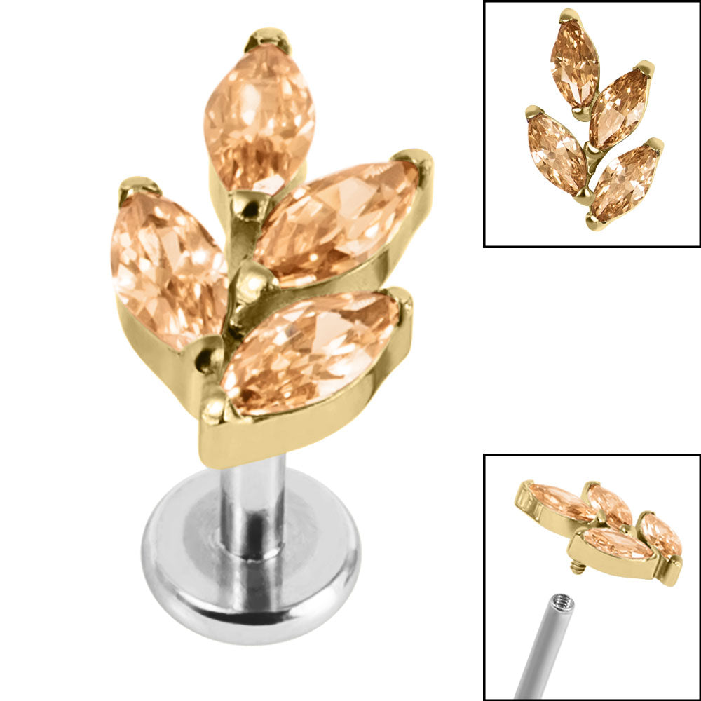 Titanium Internally Threaded Labrets 1.2mm - Gold Titanium Claw Set Marquise Jewelled Leaf