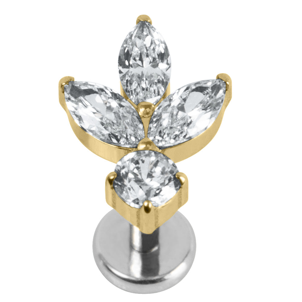 Titanium Internally Threaded Labrets 1.2mm - Gold Titanium Claw Set Marquise Jewelled Leaf