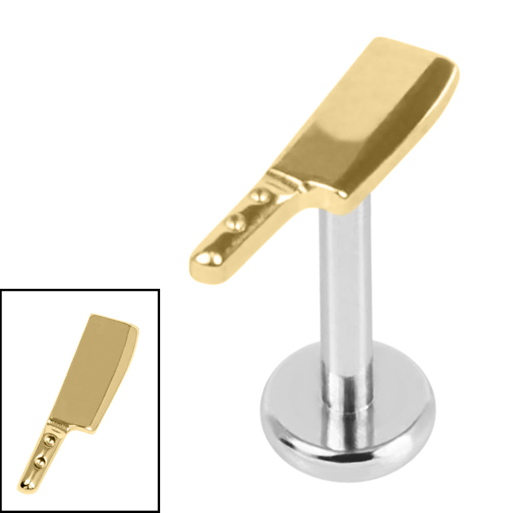 This Titanium internally threaded labret has a Mirror Polish or Gold Titanium Cleaver. This Butchers Knife is 2.1mm across, 7.6mm tall. Great for ear piercings including tragus, cartilage and helix.