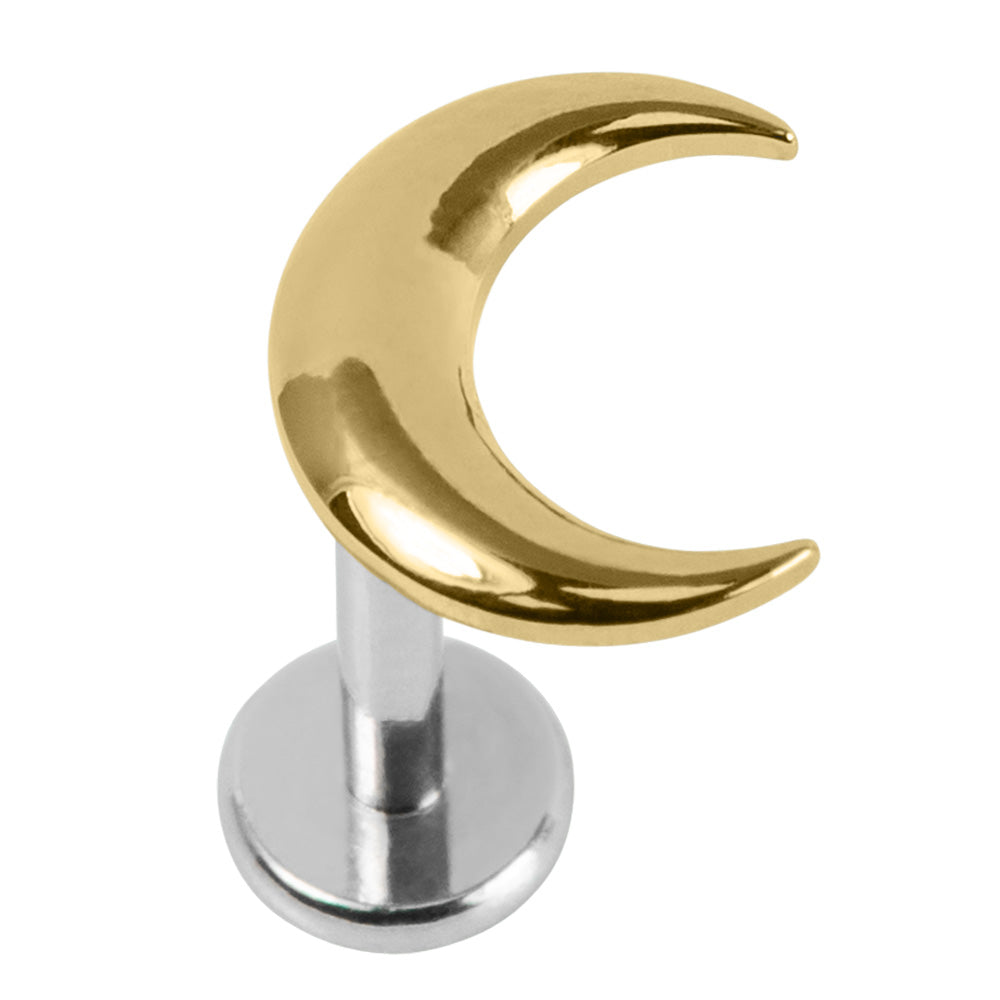 This Titanium internally threaded labret has a Mirror Polish or Gold Titanium Eclipse Moon. The Attachment is 6mm across, 7mm tall. Great for ear piercings including tragus, cartilage and helix.