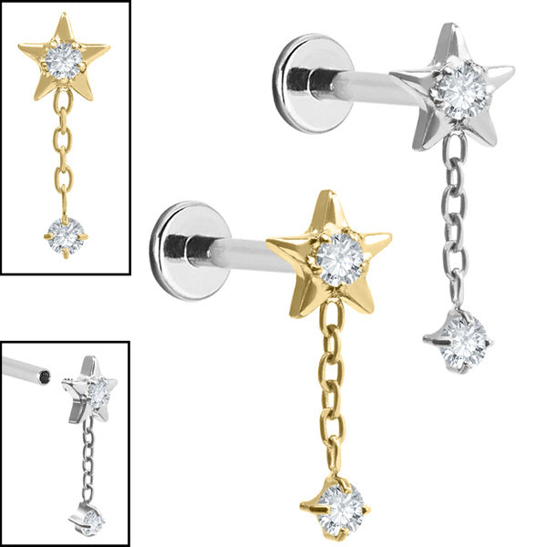 A Christmas decoration tailored for your festive curations! Our Titanium Internal thread Claw set Jewelled Reul Chain Drop Labret is a beautiful claw set round CZ with a shining star on the end of a chain drop. Titanium jewellery is perfect for new piercings. The top is approximately 14mm tall and 6mm wide and is available in Mirror Polish and Gold Titanium. Supplied on a Titanium Internally Threaded Labret or Gold Titanium internally threaded labret in 1.2mm gauge. Great for ear piercings including tragus, cartilage and helix.