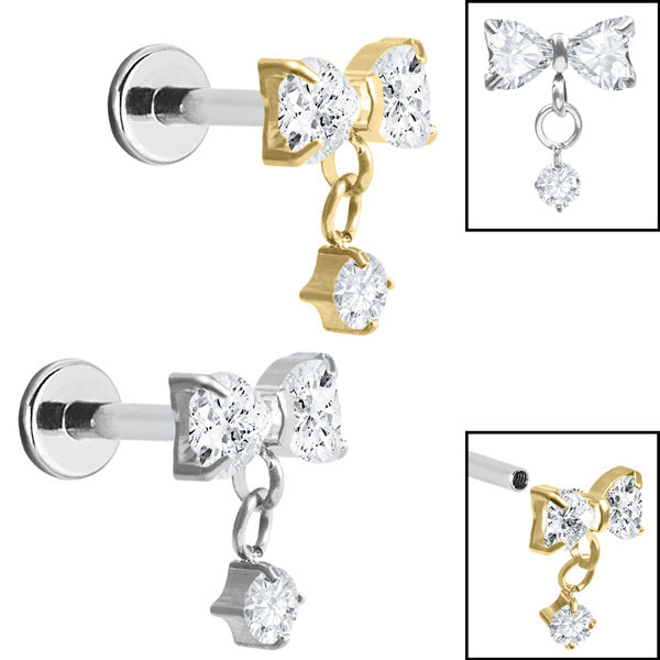 A stunning Bow with heart gems and a petite solitaire all Claw Set Jewels give this top a super cute look. The Attachment is approximately 8mm tall and 6.3mm at the widest point. It is available in Titanium and Gold Titanium. Supplied on a Titanium Internally Threaded Labret in 1.2mm gauge. Popular for ear piercings. Attachments suitable for 1.2mm internally threaded jewellery can be used with this jewellery.