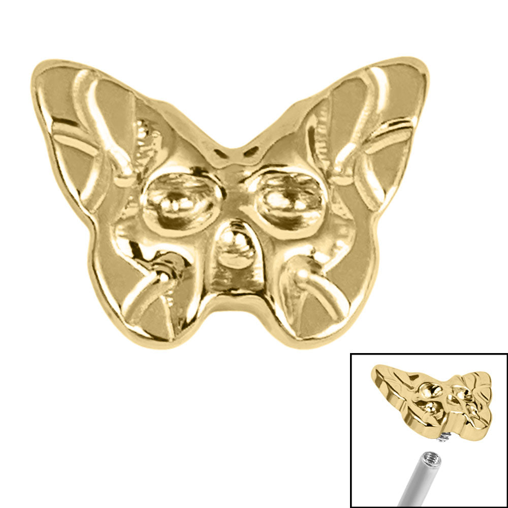 Titanium Owl Butterfly. Available in Mirror Polish and Gold Titanium, this top is for internal threaded shafts measuring 1.2mm and has the standard 0.9mm thread on it. The Butterfly measures 6.4mm wide and 4.7mm tall. This attachment will fit TDi internal thread Labret Studs, Bars etc.