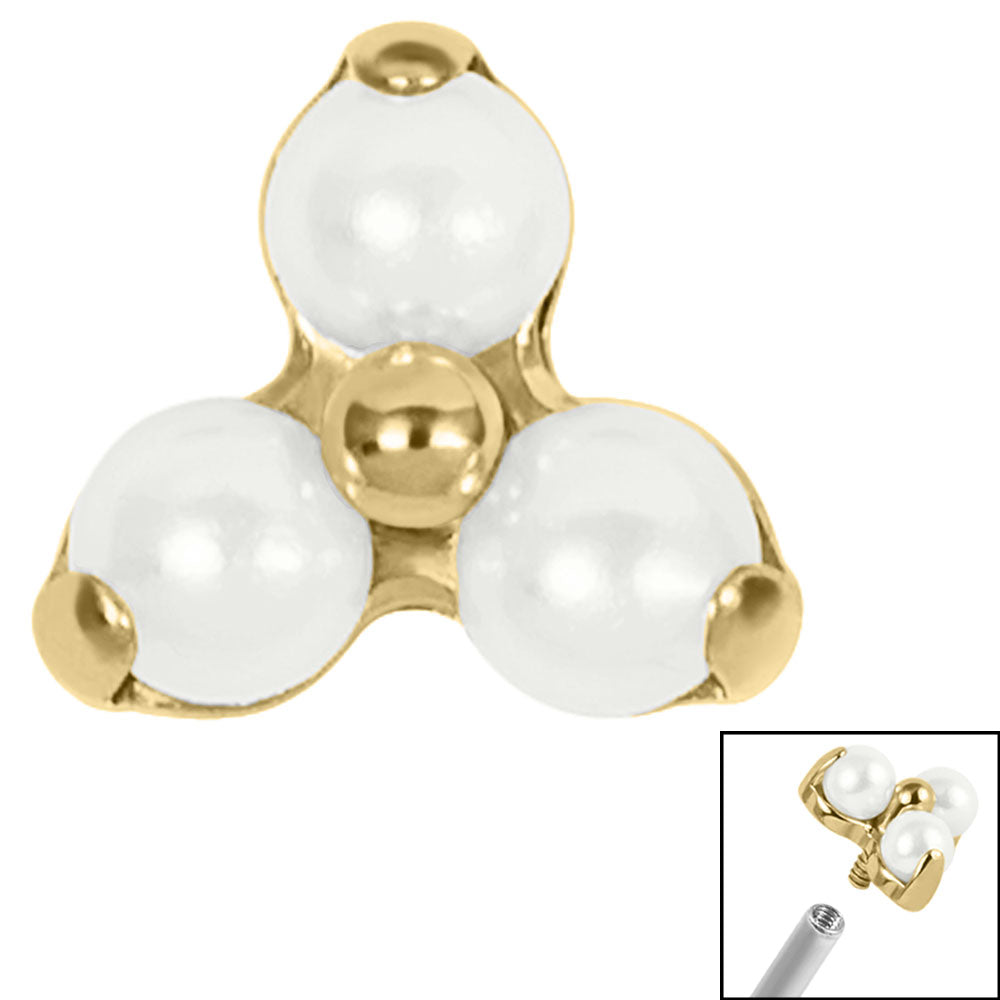 Titanium Claw Set Pearl Trinity is set with timeless White Faux Pearls. Titanium jewellery is perfect for new piercings. This attachment is approximately 5mm tall and 5mm wide and has the standard 0.9mm thread on it that will fit internal thread Labret Studs, Bars etc that measure 1.2mm gauge. Available in Mirror Polish or Gold Titanium.