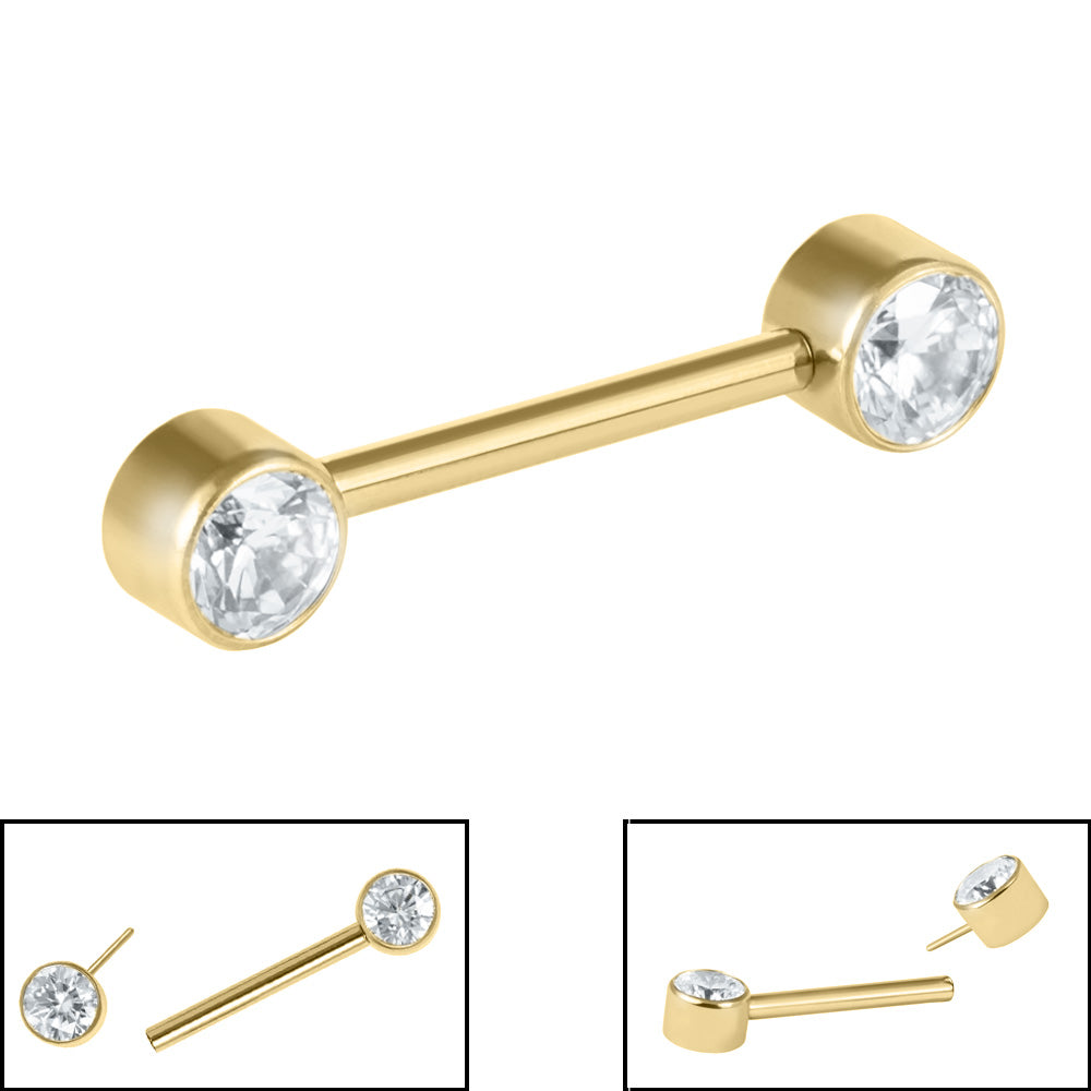 Material, Gauge (mm), Length (mm), Jewelled Disk Size (mm), Jewel Colour : Gold Titanium, 1.6mm, 14mm, 5mm, Crystal Clear, one bar only